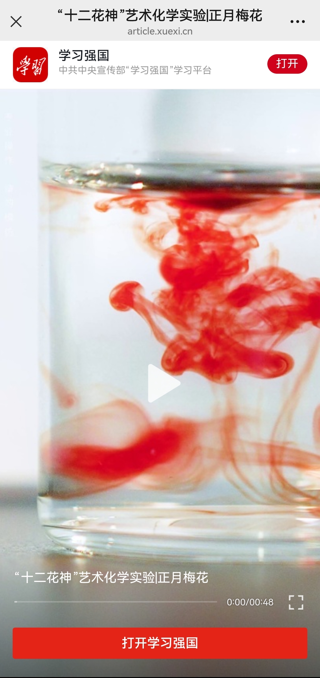 “十二花神”艺术化学实验项目以中国传统文化中的“十二月花神”为灵感,通过化学实验还原花卉的缤纷色彩与绽放形态,将古典美学与科学探究相结合。突破传统科普模式,采用“艺术+实验”的影像呈现,在飞扬花雨中解读奇妙的化学反应原理。“学习强国”平台作为国家级学习阵地,此次收录“十二花神”系列艺术视频,既是对化博创新实践的肯定,也展示了传统文化与科学教育融合的独特魅力。